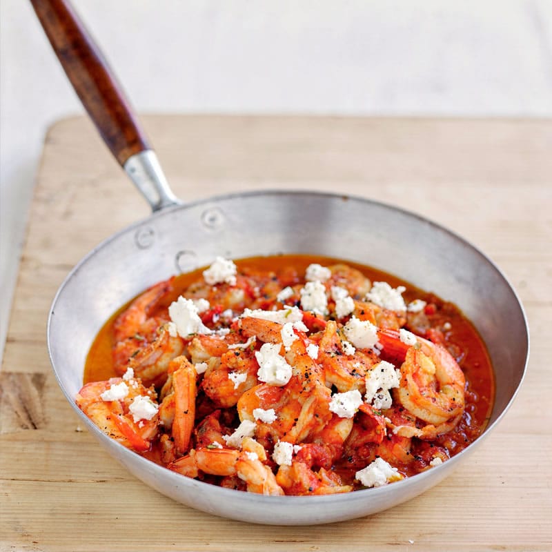 Ζουμερές Γαρίδες Αμβρακικού μαγειρεύονται σε αρωματική σάλτσα ντομάτας με κρεμμύδι, σκόρδο, λευκό κρασί καιμπούκοβο, πριν ολοκληρωθούν με χοντρά κομμάτια φέτας που λιώνουν ελαφρά στονφούρνο. Ένα κλασικό, πλούσιο σαγανάκι με ισορροπία γλυκύτητας, οξύτητας καιπικάντικων αρωμάτων