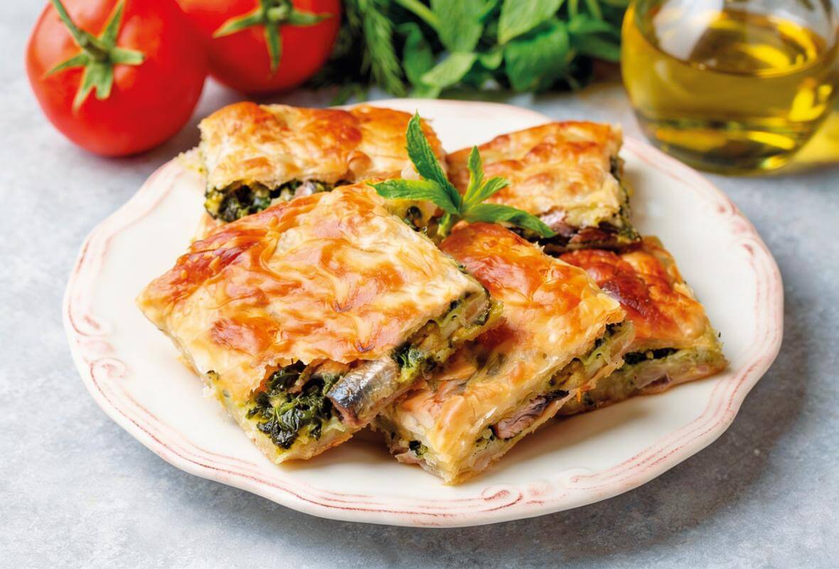 Πίταμε χωριάτικο φύλλο, γεμισμένη με φρέσκες σαρδέλες Πρέβεζας και σοταρισμέναχόρτα, κρεμμυδάκια και μυρωδικά. Ένα πιάτο που συνδυάζει τη θαλασσινή έντασητης σαρδέλας με τη γλύκα και τη φρεσκάδα των χόρτων, σε απόλυτα ισορροπημένηγεύση
