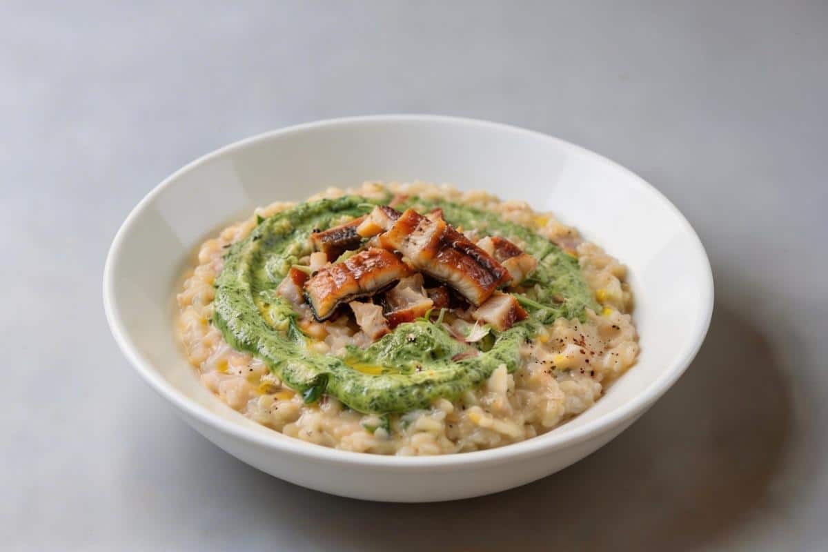 Έναπλούσιο, αρωματικό ριζότο που συνδυάζει τη βουτυράτη υφή του αρμπόριο με τηνκαπνιστή ένταση του χελιού. Η κρέμα μαϊντανού προσθέτει φρεσκάδα καιφωτεινότητα, δημιουργώντας ένα πιάτο βαθιά γήινο αλλά ταυτόχρονα κομψό, μεαναφορές στην ηπειρώτικη παράδοση και μια σύγχρονη γαστρονομική ματιά