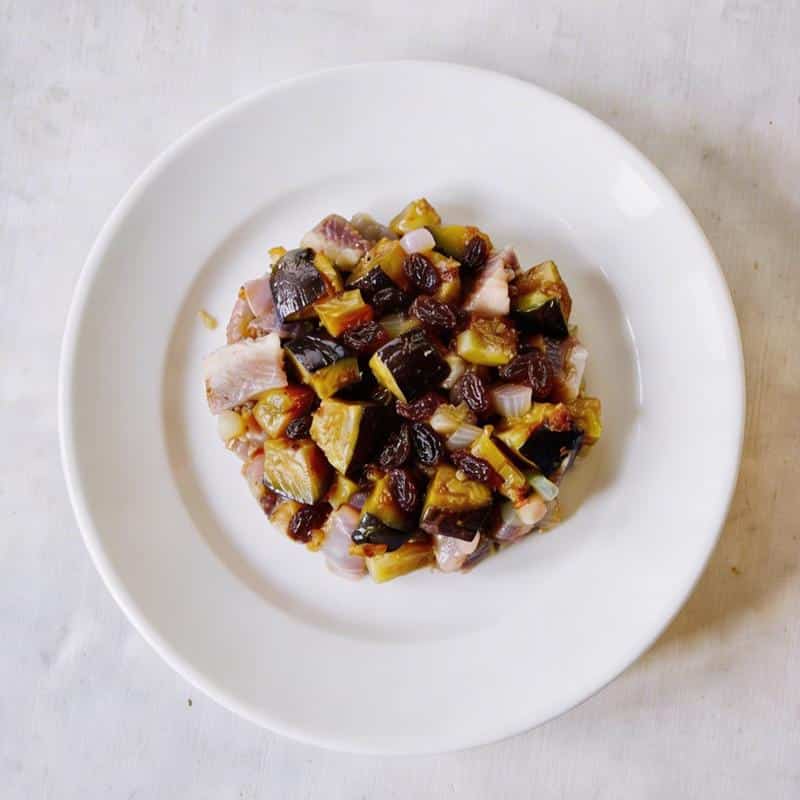 Ταρτάρ ωμού χελιού με καπόνατα μελιτζάνας